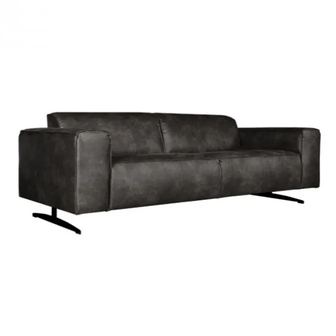 Deze stoere 2 zitsbank heeft met zijn diepe zit met bonellvering en lage rugleuning een moderne uitstraling. De Lambada heeft vaste kussens met opstaande naden en is uitgevoerd in de antraciet-kleurige recycle leersoort Colorado. De unieke brede poten zijn van zwart metaal. Houd je van een stevige zitting en een stoere industriële uitstraling, dan is dit jouw bank!