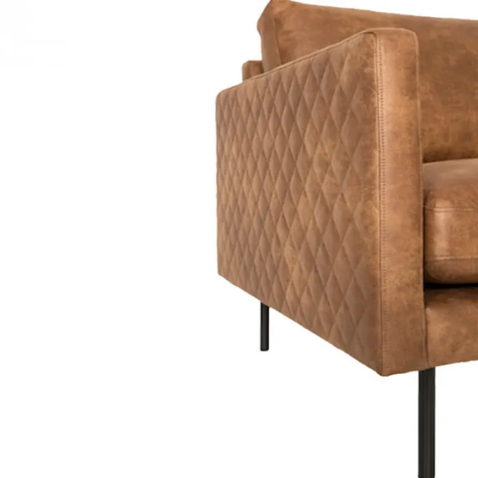 Deze stoere 3 zitsbank uit de Daisy serie heeft bewerkte armleuningen met gestikt ruitpatroon. De smalle hoge poten zijn van zwart metaal. Doordat de bank zo hoog op zijn poten staat, creëer je een ruimtelijk effect en houd je het interieur luchtig. De perfect bank dus voor wanneer de kamer niet zo groot is. De bank is in een gerecyclede leersoort bekleed in de populaire kleur cognac.
