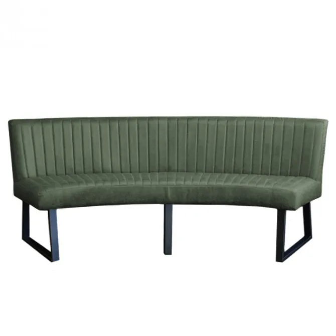 HomingXL ovale eetkamerbank geschikt voor een ovale tafel met een afmeting van 240 cm. Deze stoere ovale eetkamerbank Hengelo is gestoffeerd met de prachtige groen-kleurige lederlook stof Missouri 10. De bank is uitgevoerd met zwarte metalen poten. Deze eetkamerbank heeft een stoere uitstraling en is zowel geschikt voor een industrieel als een modern interieur.