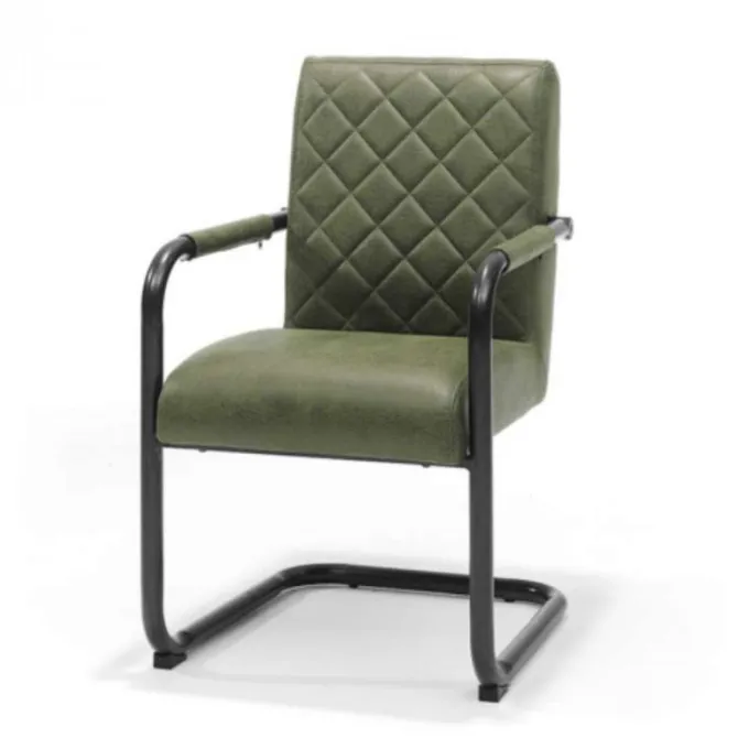 De eetkamerstoel Monaco is een stoere, industriële eetkamerstoel bekleedt met een lederlook stof Maya in de kleur groen. Het ‘zwevende’ model geeft de stoel niet alleen een mooie look, maar zorgt er ook nog eens voor dat de stoel heerlijk comfortabel zit! Zo kun je urenlang heerlijk tafelen…! De Monaco stoel is uitgevoerd met zwart gepoedercoat metalen poten. De rugleuning is voorzien van decoratieve stiksel.