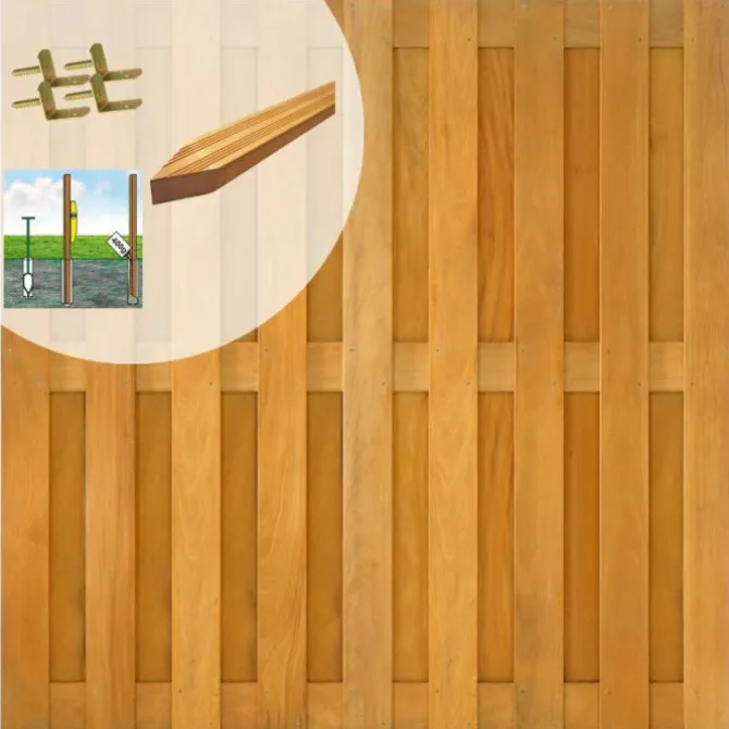 Complete set van 3 tuinschermen almendrillo 180 x 180 cm. Aangevuld met 4 hardhouten tuinpalen 7 x 7 cm met een lengte van 275 cm. Hiermee kun je een afscheiding maken van maximaal 5,68 meter breed en 1,80 meter hoog.