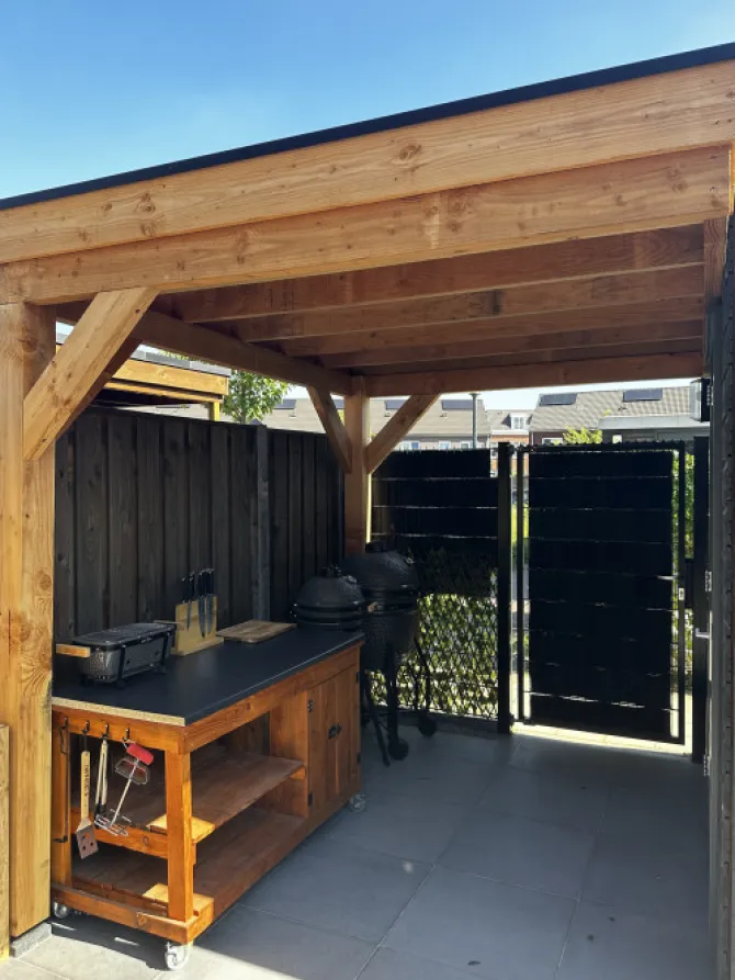 Je dient zelf nog te zorgen voor de aansluiting aan de muur of schuur. Dit kan een extra balk zijn of muurbevestigers.