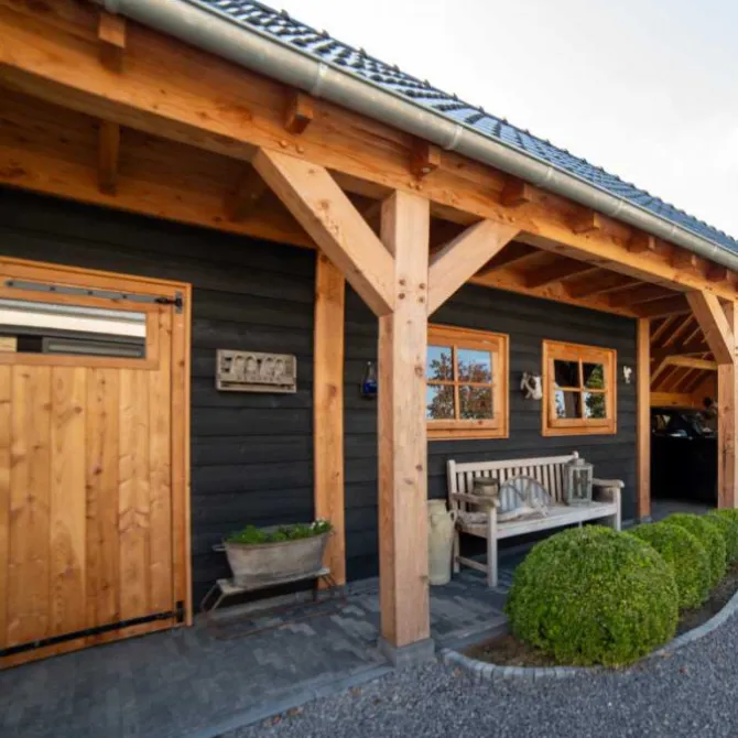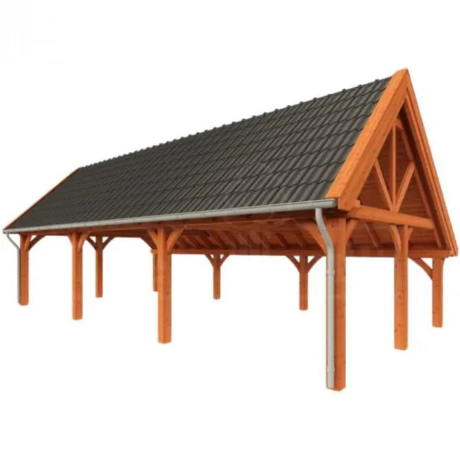 Trendhout Kapschuur De Hofstee XXL. Dit is het basis model van 5 meter diep en beschikbaar in diverse breedte maten. Wil je deze kapschuur helemaal naar eigen wens samen stellen klik dan op de knop hierboven en ontwerp je kapschuur in de 3D configurator.