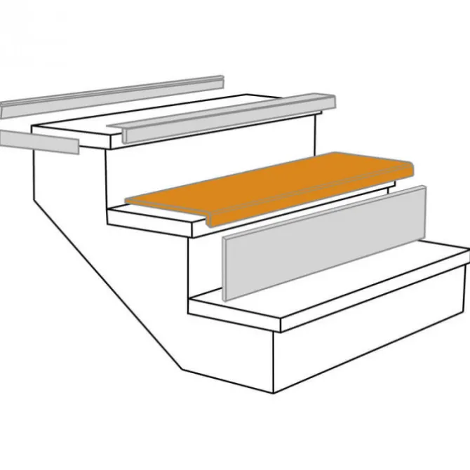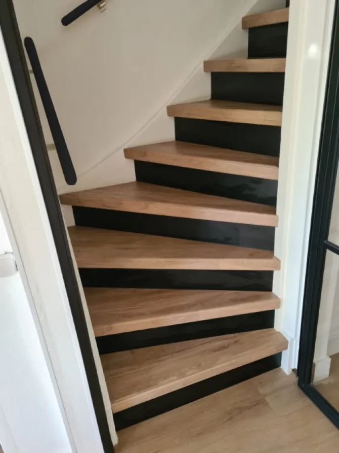 Overzettrede met neus – Laminaat – Burgos eiken truffel. Voor de rechte treden van de trap zijn er overzettreden beschikbaar van 100 x 30 cm. Voor de grotere traptreden in huis waar een draai in zit, zijn er overzettreden van 130 x 38 cm beschikbaar.