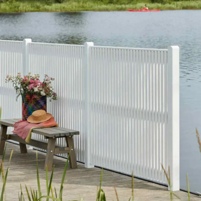 Plus tuinscherm recht vuren geïmpregneerd en wit afgelakt uit de serie Sendai. De afmetingen van dit scherm zijn 180 x 180 cm (b x h). RVS geschroefd.