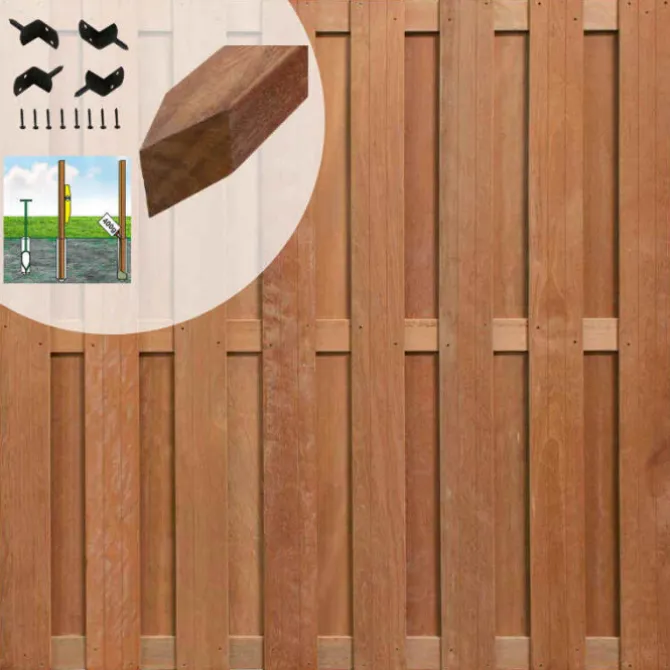 Smaragd Schutting set hardhout keruing Robuust recht 15L v-groef (5,74 meter). Complete set van 3 hardhouten tuinschermen 180 x 180 cm. Schermdikte 4,5 cm. Aangevuld met 4 hardhouten tuinpalen 8,5 x 8,5 cm lengte 250 cm. Hiermee kun je een afscheiding maken van maximaal 5,74 meter breed en 1,80 meter hoog. De schuttingen zijn eenvoudig in de breedte in te korten door de planken eraf te schroeven en de liggers door te zagen.