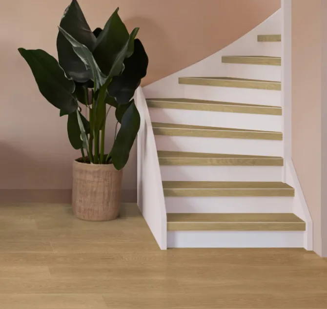 Dit is een complete Stepwoord traprenovatieset met SPC toplaag traptreden in de kleur bruin eiken met witte stootborden, inclusief montagekit en afwerkingskit. Deze complete set is geschikt voor een rechte trap met 15 treden. De set wordt geleverd inclusief witte stootborden, omdat het een set voor een dichte trap betreft.