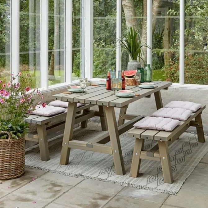 Plus Danmark tafel vuren Country gegrond in de kleur grijsbruin (RAL 7023). Het tafelblad heeft een lengte van 177 cm, breedte van 75 cm en een hoogte van 72 cm.