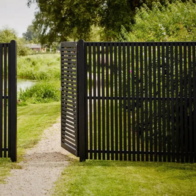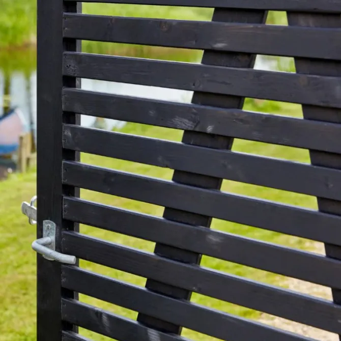 Plus tuinpoort recht vuren geïmpregneerd en zwart gegrond uit de serie Tokyo. De afmetingen van deze tuinpoort is 100 x 180 cm (b x h). De afstand tussen de latten is 21 mm. De tuinpoort wordt geleverd inclusief beslag. Kleur: zwarte grondlaag op waterbasis, dichtstbijzijnde RAL 9005 (dient afgebeitst te worden).