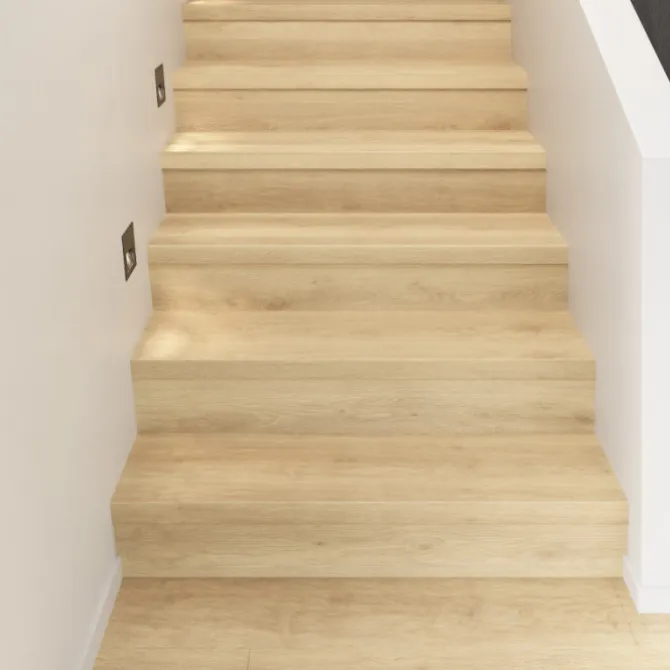 Maëstro Steps uitlooprofiel Cashew oak 100 x 5,6 cm. Dit is een extra ‘neus’ met een aluminium profiel, waarbij je de aansluiting kan maken met de verdiepingsvloer.