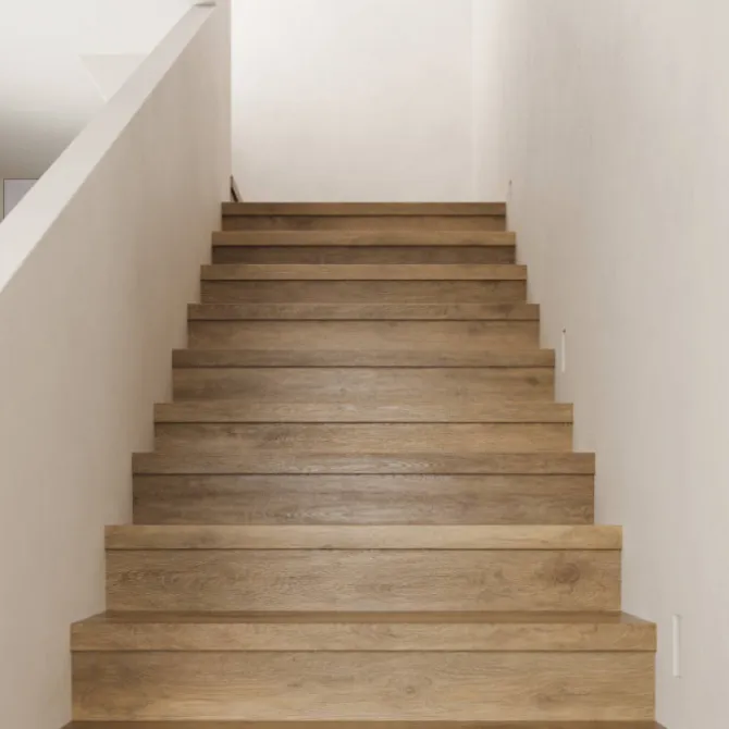 Maëstro Steps uitlooprofiel Pecan oak 100 x 5,6 cm. Dit is een extra ‘neus’ met een aluminium profiel, waarbij je de aansluiting kan maken met de verdiepingsvloer.
