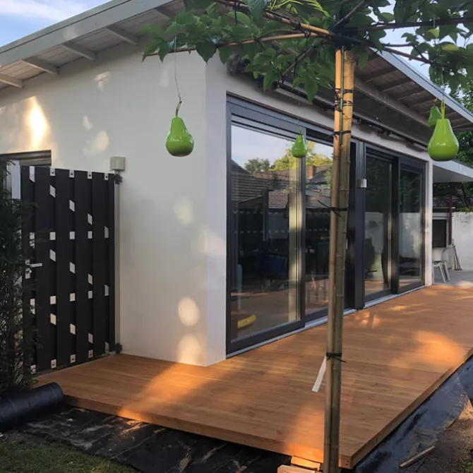 Smaragd vlonderplank totaalpakket hardhout Bankirai 2,5 x 14,5 cm (3,95 mtr) groef/vlak. Vlonder totaalpakket voor 1m2 gelegd met vlonderplanken van 395 cm. Dit pakket bevat 1 m2 planken, inclusief schroeven. Per m2 zit er ongeveer 2,3 strekkende meter onderbalk bij (lengte van de onderbalken is 300 cm). De terrasplank is 2-zijdig geprofileerd en kan naar eigen voorkeur gemonteerd worden.